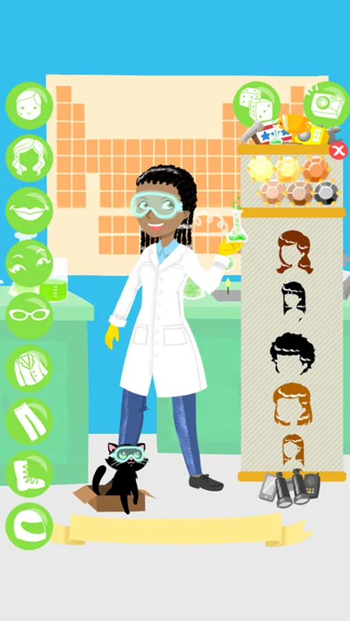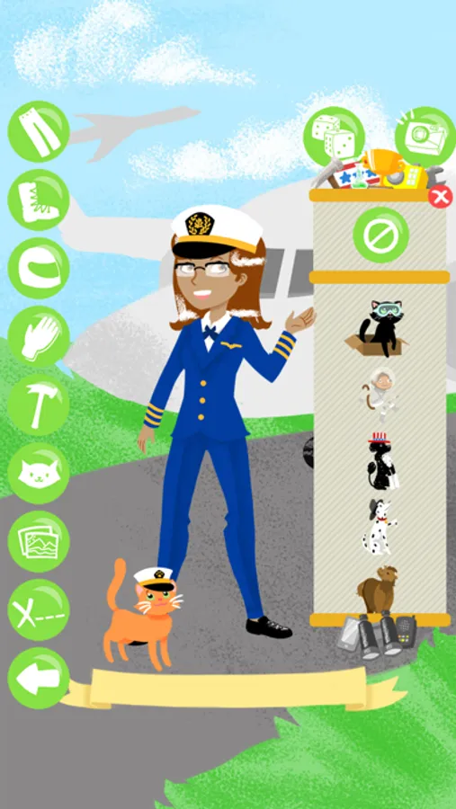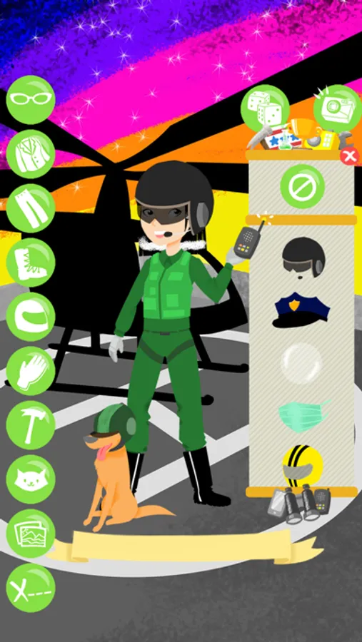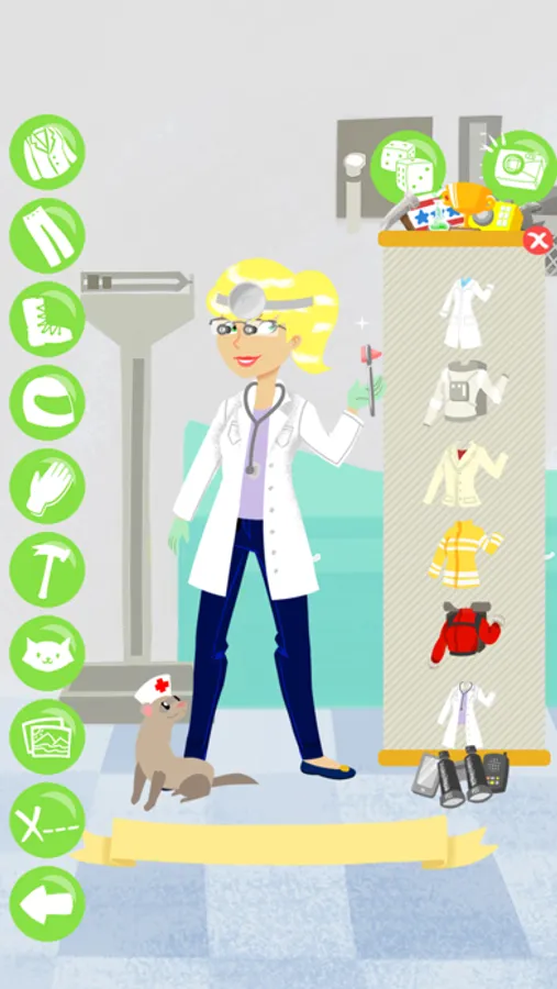 Play the app as a traditional dress-up game or for extra fun you can roll the dice to randomize the doll- and her outfit! Will you end up with Space Cop, ruler of the Galaxy? Or will you be the General Surgeon on top of Mount Everest? Perhaps Judge Deep-Sea Diver is more to your liking.