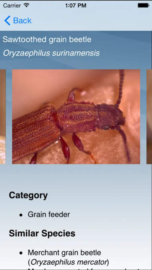 Identify insects in stored grain and take steps to control them. Includes colour photographs and descriptions of 15 of the most common insects found in grain stored on the farm, in elevators or warehouses. Developed by entomologists from the Canadian Grain Commission and Agriculture and Agri-food Canada, this app is a reliable resource for Canadian farmers and other members of the grain industry.