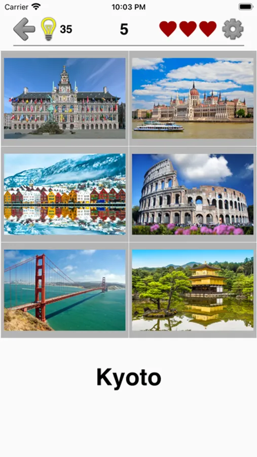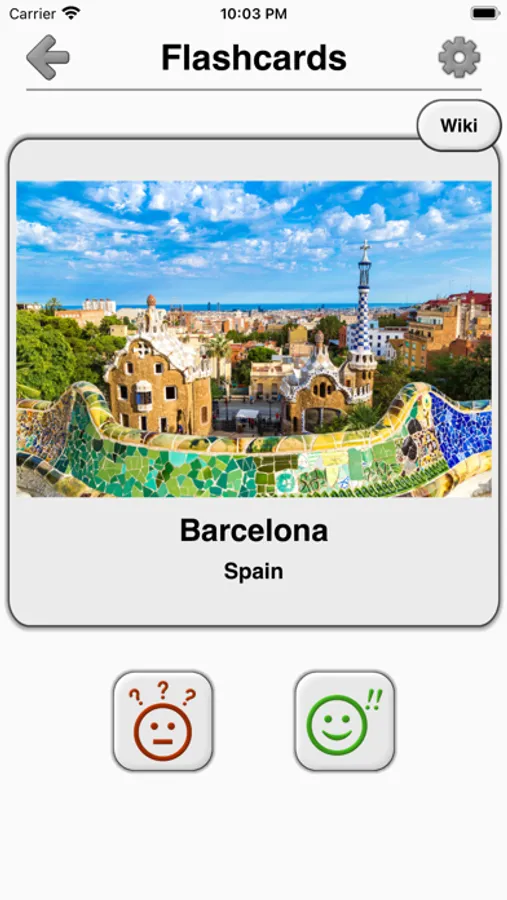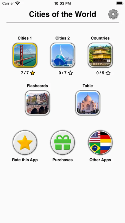 * Flashcards, where you can browse all pictures, cities and countries and check which you know well and which ones you want to repeat later.