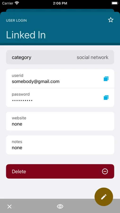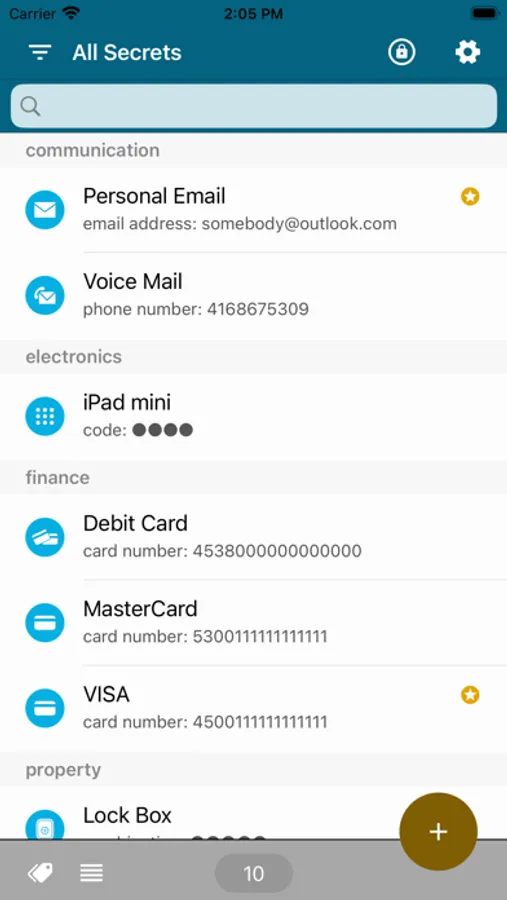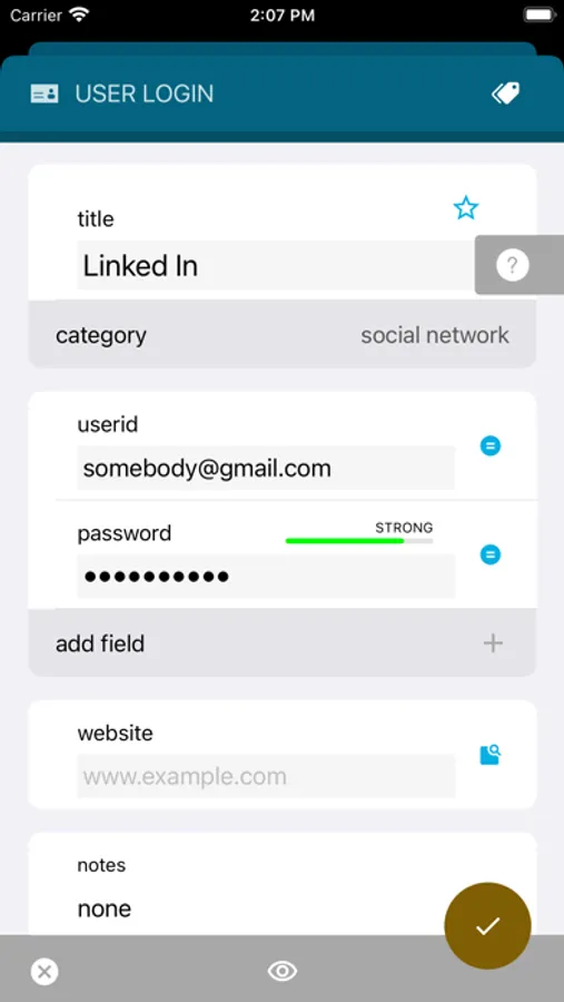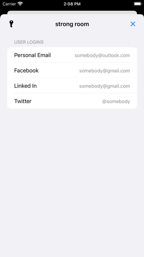 strong room doesn't just store passwords. You can store any type of user login, email account, credit card, debit card, access code, voicemail account, combination code, or client account. All in one place!