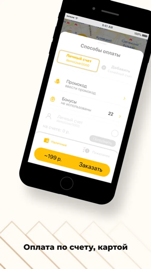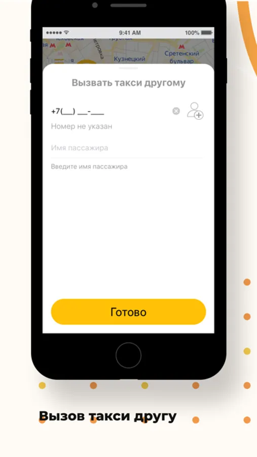 Следите за поездкой на карте. Приложение сообщит время подачи, марку, цвет, номер машины, а также имя водителя.