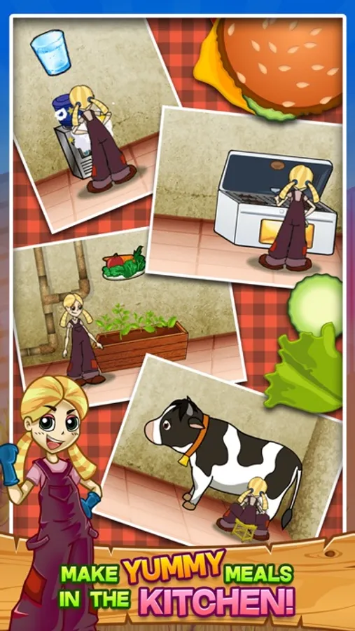 The farmer's daughter runs the kitchen, where she serves up yummy hamburgers, salads, water and milk.