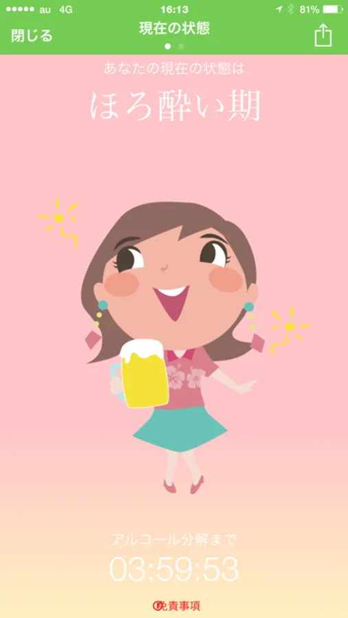 飲酒内容を登録した後に、カレンダー右上のアイコンをタップすると、現在の酔いの状態を確認することができます。