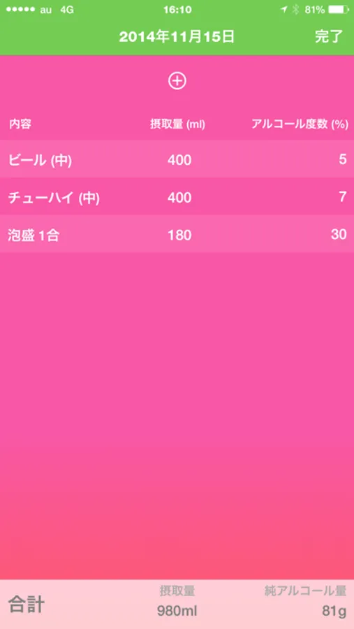 また、スライドさせると「摂取量」「純アルコール量」「ドリンク数」「血中アルコール濃度」「酔いの状態」の詳細を確認できます。