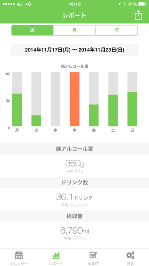 レポートは「週次」「月次」「年次」の3種類があり、それぞれ純アルコール摂取量を棒グラフで表示し、比較がしやすくなっています。