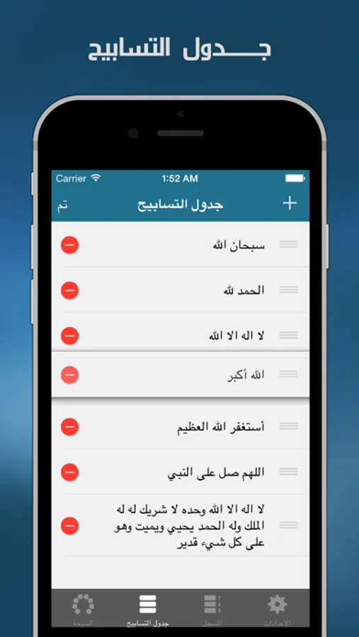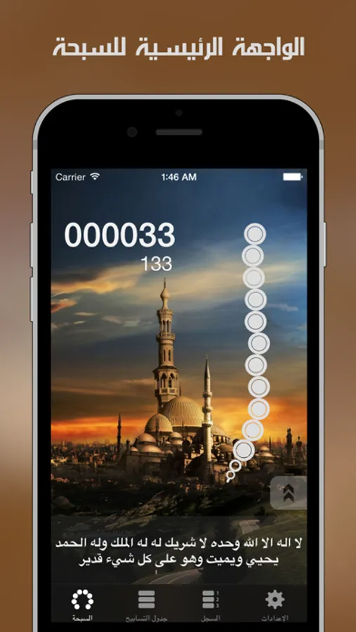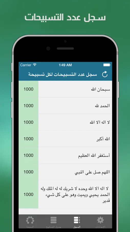 • سجل خاص يوضح لك عدد التسبيحات التي قمت بها لكل تسبيحة،