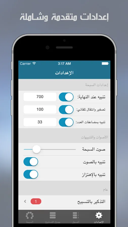 • خيار للتنبيه عند النهاية من التسبيح بالوصول إلى العدد المطلوب