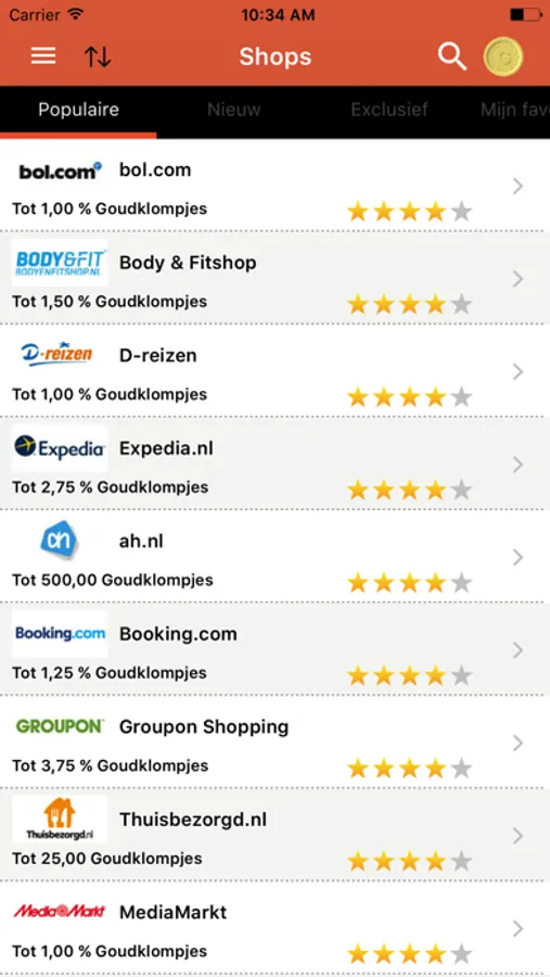 Zoek in het uitgebreide aanbod van aangesloten webshops en zie direct hoeveel Goudklompjes jij van GekkenGoud.nl krijgt. Heb je jouw shop gevonden? Klik op de button en shop met Goudklompjes!