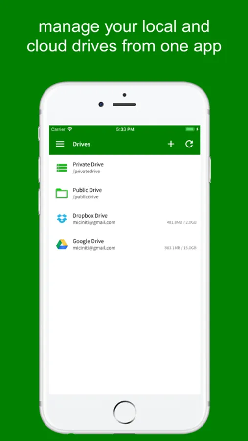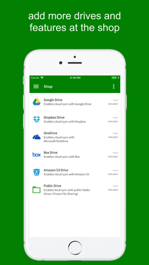 Private drive is free. Public Drive (iTunes File Sharing), HTTP Web Server and cloud storage drives are available via in app purchase at the Sync Shop.