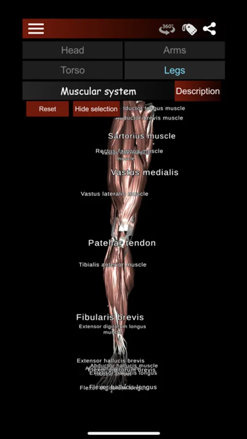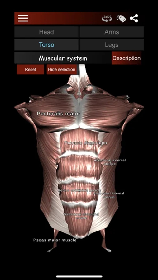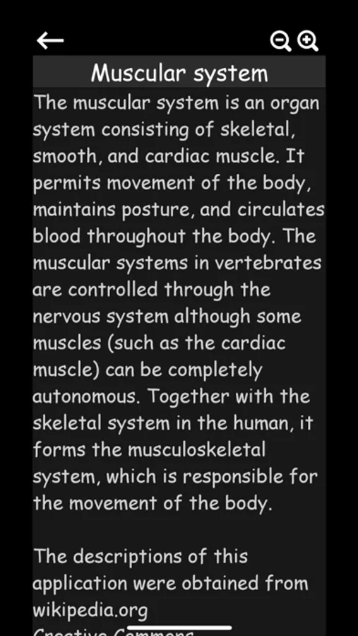 Shows a three-dimensional models of muscular system and a description of every muscle in the human body.