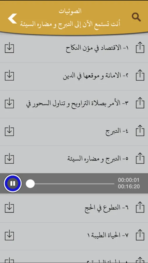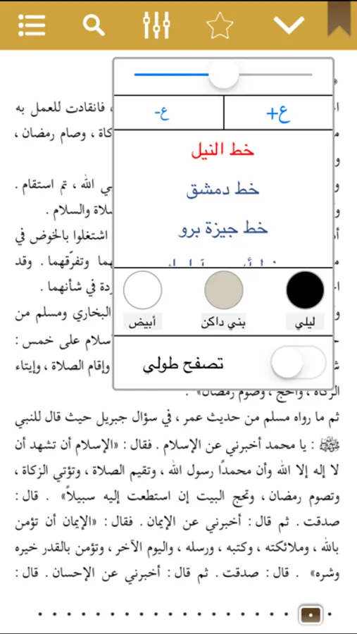 البحث العام في البرنامج، البحث المختص لكل قسم، تحديد نتائج البحث، المشاركة على الشبكات الإجتماعية والواتس آب، إمكانية تغيير الخلفية، تصغير وتكبير الخطوط، تغيير الخطوط، تنظيم إضاءة الشاشة، اختيار طريقة التصفح الطولي والعرضي، إمكانية إستماع الصوتيات في الخلفية والرابط إلى موقع الشيخ رحمه الله، رابط التويتر
