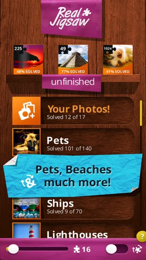 The download size is worth it: that's due to the vast amount of free photo puzzles packs included, such as: beach puzzles, mountain, castle, pet jigsaws, cats and dogs puzzles, Halloween jigsaws, etc.