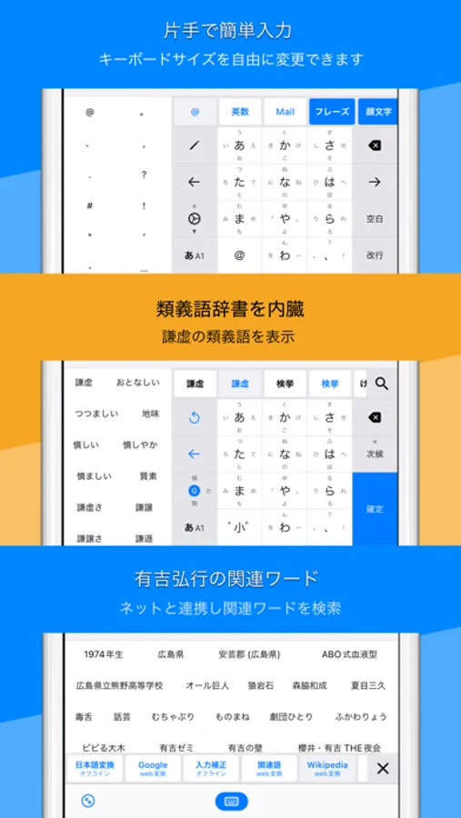 In addition to the usual Japanese conversion, it also performs synonym conversion. The thesaurus is built into the keyboard, so you can convert offline.