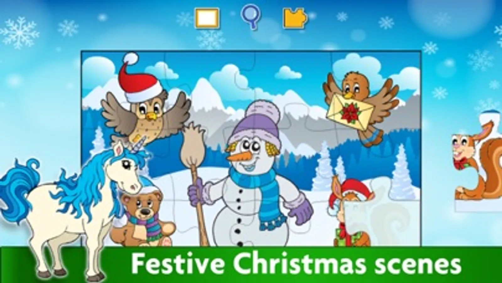 Puzzles in this kids game include Santa Claus riding with Rudolph the reindeer, Frosty the Snowman, Christmas candy and gingerbread cookies, and many more festive winter and Xmas holiday scenes.