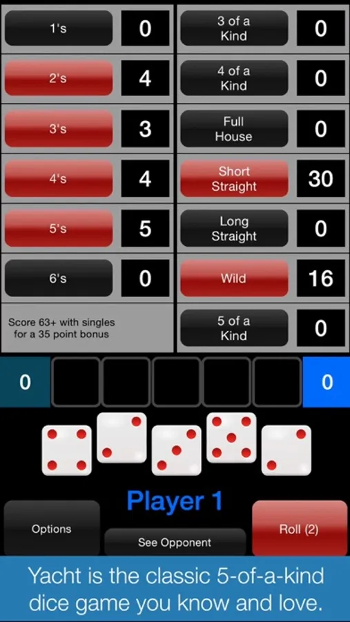 Classic Yacht - The most famous version of the game! Played with 5 dice. Score your rolls in one of 13 categories including 5-of-a-kind also known as a Yahtzy!
