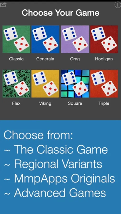 Colors - Dice of three different colors. Scores depend on the color of the dice which adds a new dimension to the classic. game.