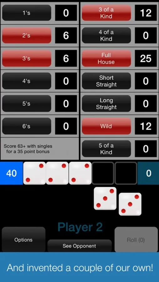 Each turn you roll 5 dice with up to two additional re-rolls of some or all of the dice. You must assign the result to one of 13 different scoring categories. There is a lot of strategy involved in which dice to keep and which to re-roll and what category you assign the result to as each category can be used only once.