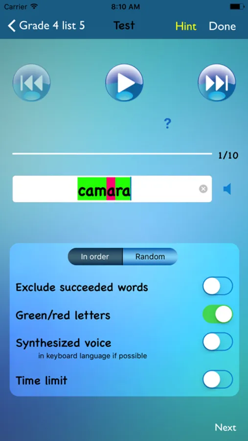 • Play words sequentially or randomly, using your recorded voice or a synthesized voice.