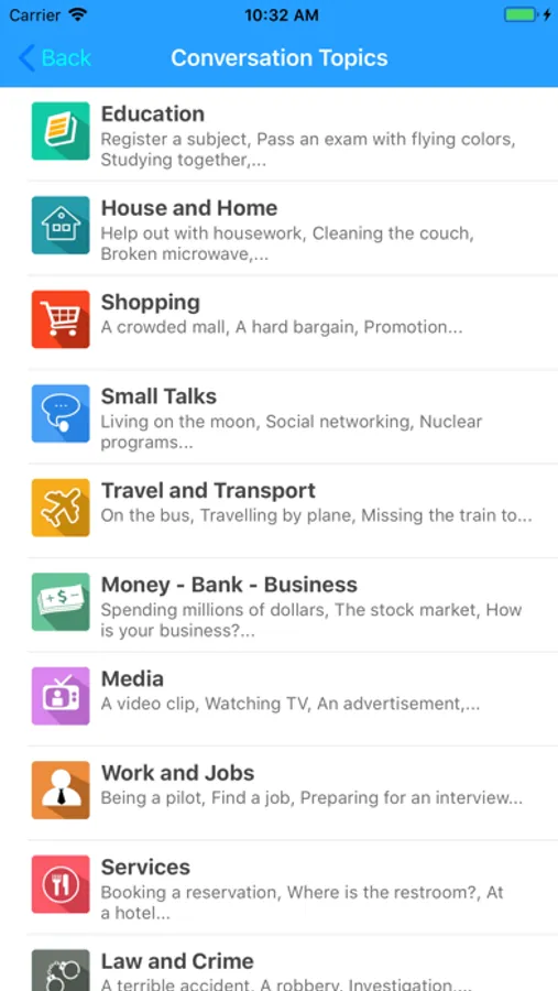 - 1000+ conversations with American native speakers. All conversations are separated into many real-life topics.