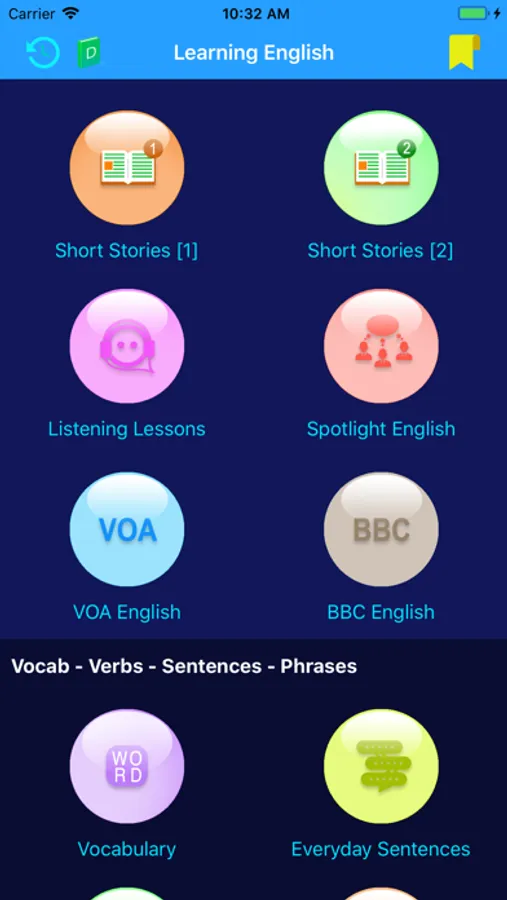 You can find everything you need for learning English by downloading this app: English Conversation, Listening, Speaking, English Idioms and Phrases, Vocabulary, Single Sentences, Short Stories, Essays, English Grammar, Daily News, Games and Tests, IELTS, TOEIC, etc.