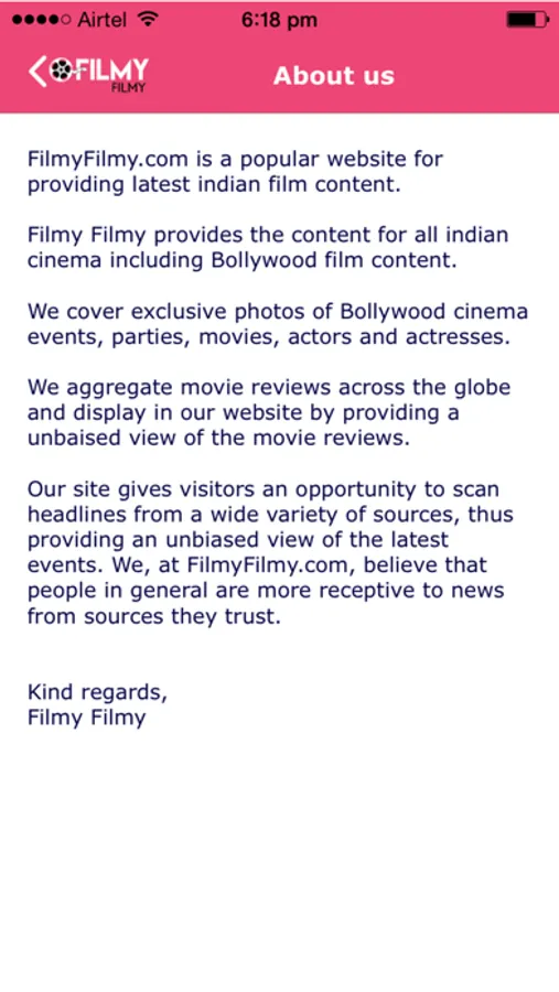 Filmy Filmy is a popular bollywood site for latest indian movie news, bollywood reviews, hindi trailers, gossip, juicy headlines, box office updates, launches, screening, events, fashion update. Visit the app to get up to date information of bollywood.