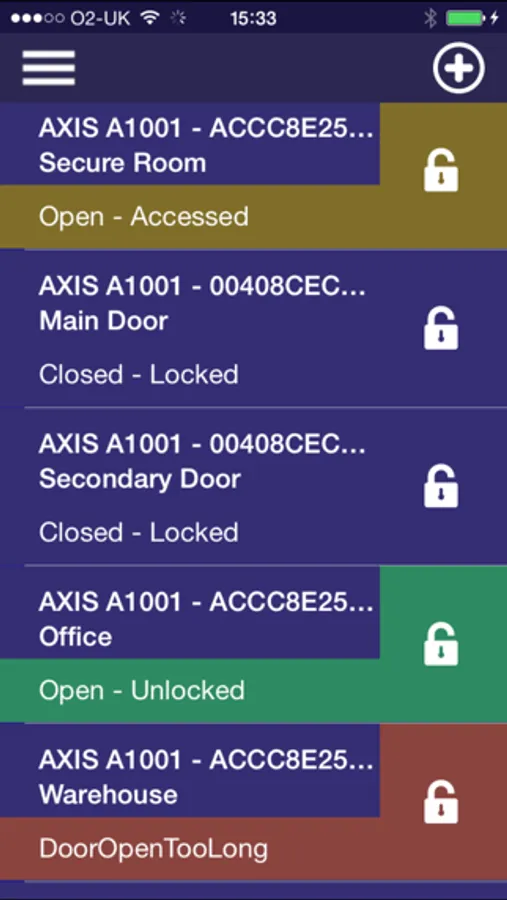 - Individual colour coded status for Locked, Unlocked, Access and Alarms.