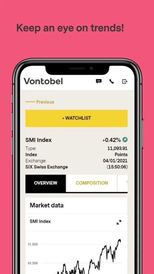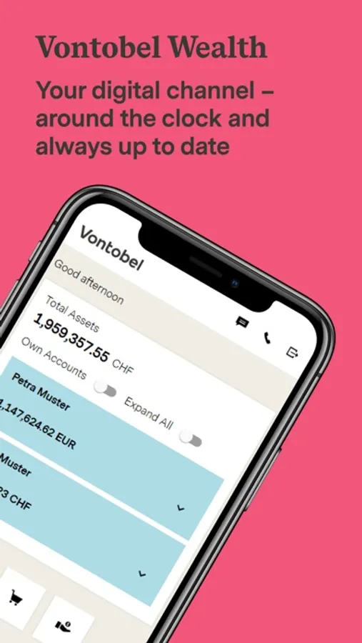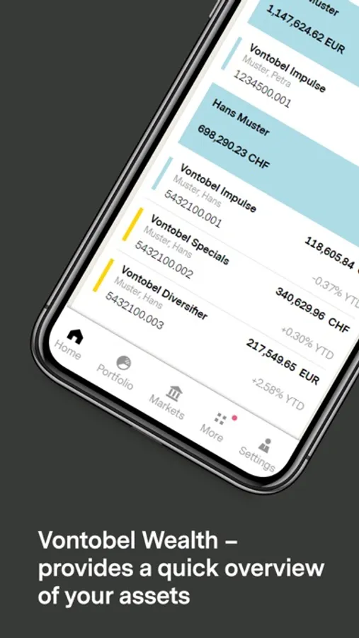 The Vontobel Wealth app gives you access to your banking at any time. Whether you would like to view and analyse your portfolio, check account bookings, read research and market information, look for investment ideas or just receive your bank documents digital – carry out your banking activities when you have time and wherever you are. You are also able to contact your relationship manager directly in the app. And this is all via a secure encrypted connection, which meets all the latest security requirements.