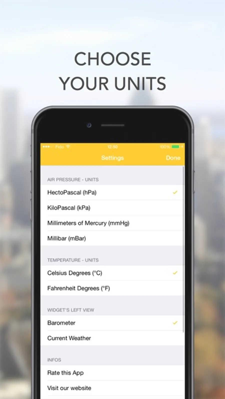 Easy Weather give you the ability to use your phone as an awesome barometer. If you're using a iPhone 6, 6 Plus or an iPad Air 2 you will be able to read directly the current pressure reaching the internal sensor.
