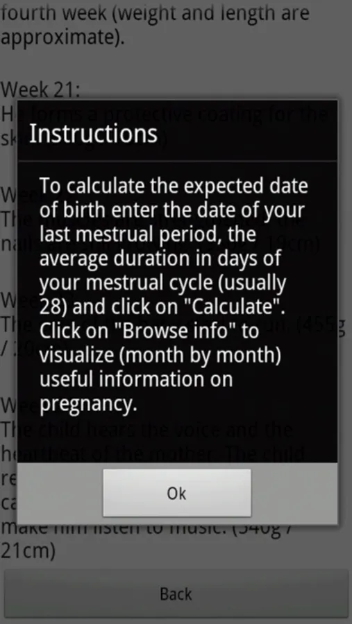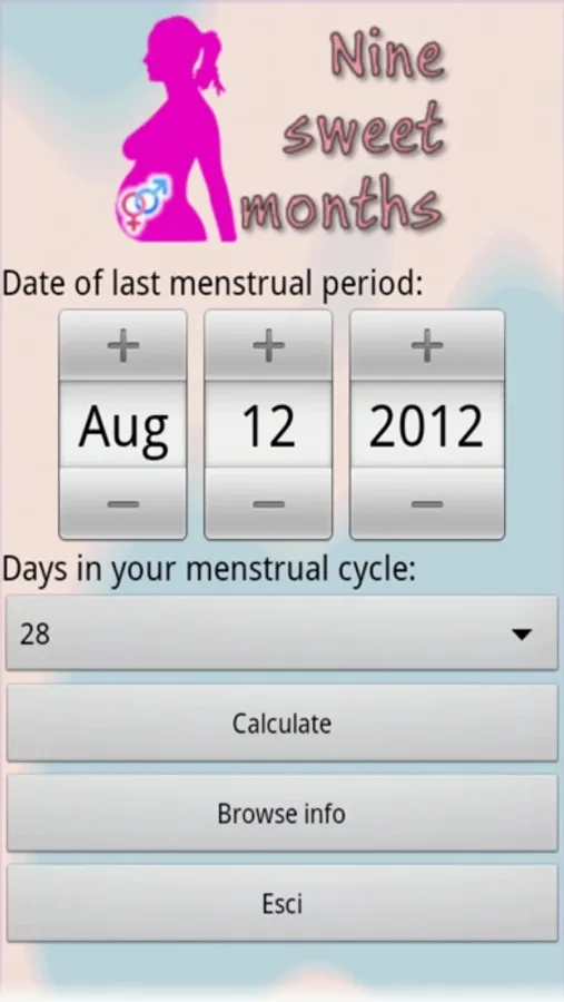 This application calculate the expected date of birth and conception for pregnant women from the date of the last menstrual period and the duration of the menstrual cycle.