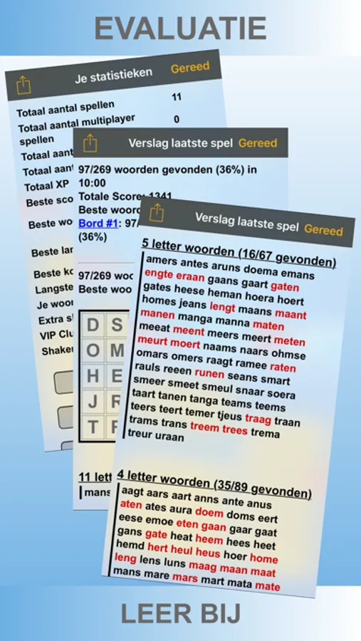 - Volledige beoordeling achteraf met gevonden en gemiste woorden