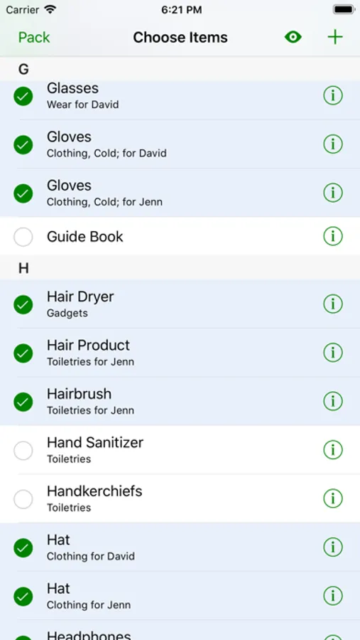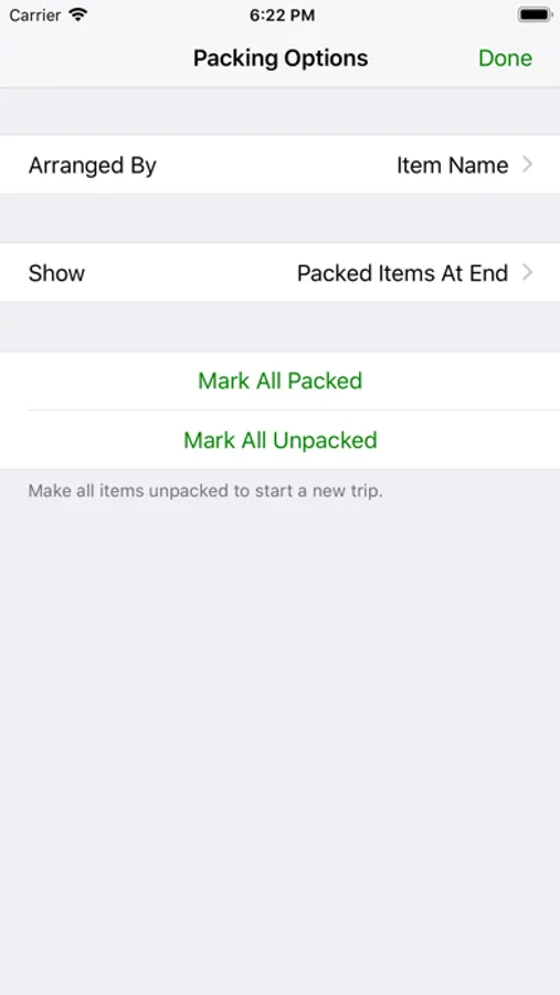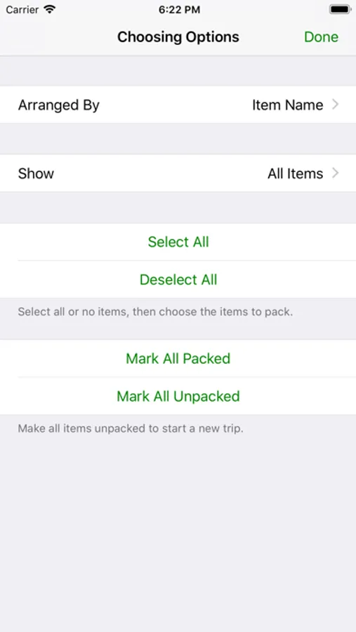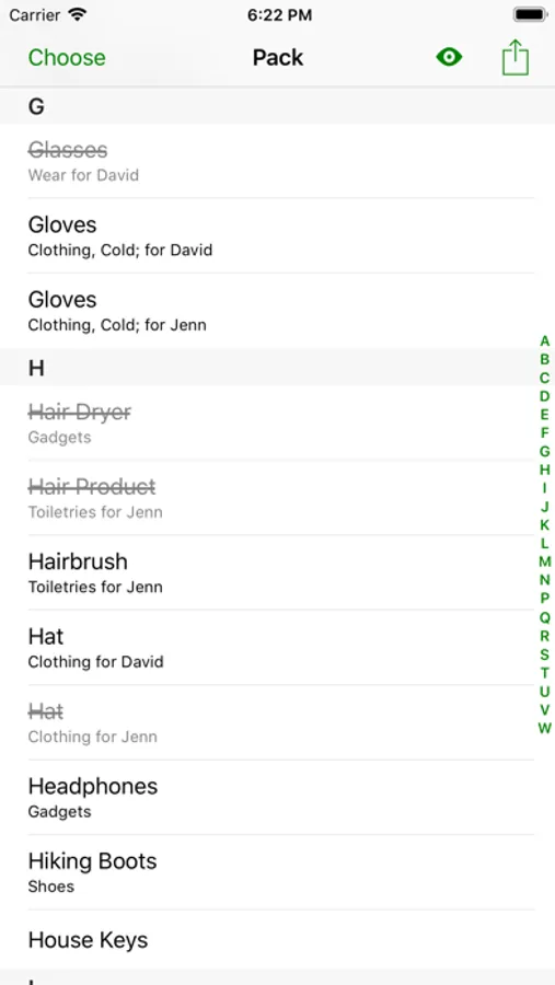The Choose and Pack lists can be arranged by item name, tag, or person name, and can be filtered to show only packed, packed at the end, or all.