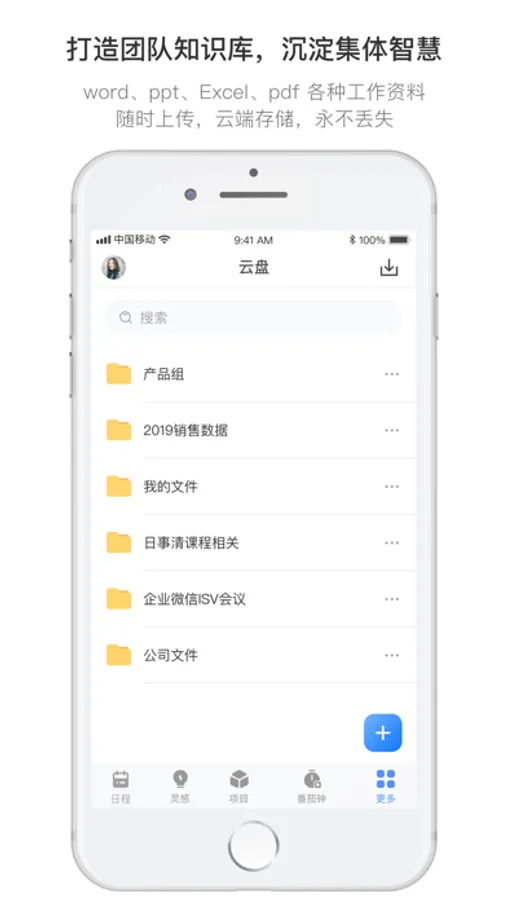 • 知识管理:多层级知识库记录学习/工作心得,更好地沉淀知识;支持多种类型附件上传云盘,大容量存储空间,随时随地上传下载。