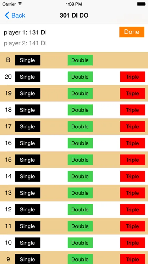 Once configured the game allows the players to enter dart throws as number single, number double or number triples and updates the scores for the players.