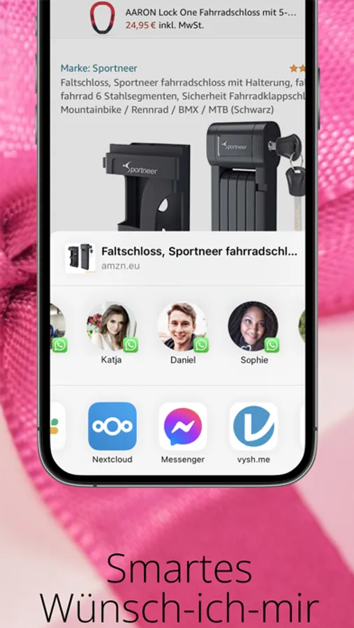 Du hast ein Produkt gefunden, das du unbedingt haben möchtest? Teile es mit vysh, und voilà – schon ist es in deiner vysh.me Wunschliste gespeichert! Egal ob Mode, Elektronik, Bücher oder Dekoration – alles in einem Klick erledigt.
