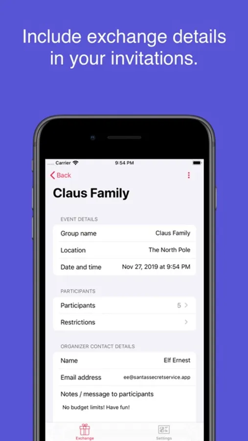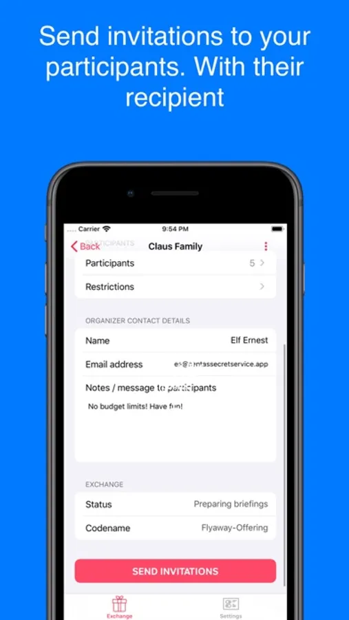The free version of "Santa's Secret Service" can 1 group and up to 5 participants. Free version users may resend invitations through their own email, in case they did not receive the original invitation, and take a look at the matching list.