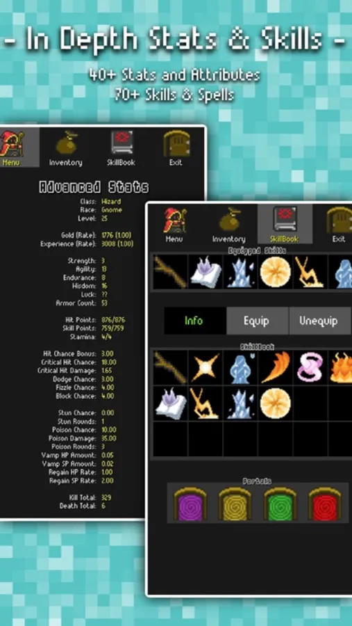 12 equipment slots to to fully customize your characters - (Weapon, Shield, Helmet, Chest, Gloves, Legs, Boots, Belt, Bracelet, Necklace, 2x Rings)