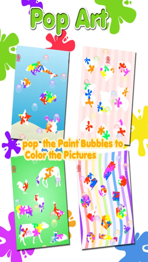 Pop Art: Pop The paint bubbles over the picture shapes you want to color in. Use your imagination to come up with fun color combinations. The different picture scenes include: animals, shapes, fish and other underwater animals and teddy bears.