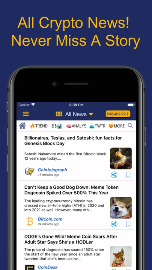 BTCnews, the #1 and most established crypto news app in the store, brings you all the very latest news, analysis, and research about the world of Bitcoin and other Cryptocurrencies, from all the very best sources, updated throughout the day. In addition, financial information and charts are now included for numerous cryptos. Too busy to sift through all the news? Trending news and interesting items are curated and tagged for quick access. Or, choose your favourite sources or favorite topics for a quick check.
