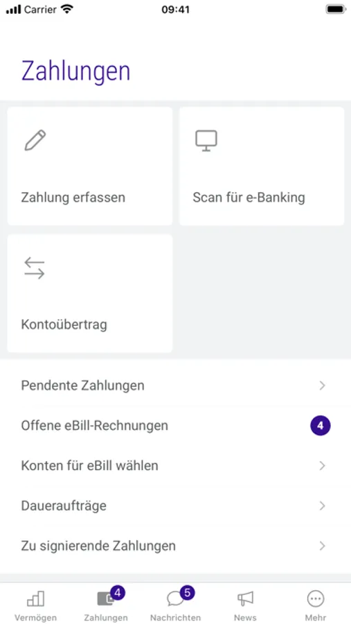 • Zahlungen: Inlandzahlungen können Sie bequem via App ausführen. Tätigen Sie Kontoüberträge, erfassen Sie Daueraufträge, scannen Sie Einzahlungsbelege mit der Handykamera oder geben Sie eBills frei. Zahlungen an neue Zahlungsempfänger können in der App erfasst, müssen aber aus Sicherheitsgründen vor der Ausführung einmalig im e-Banking signiert werden. Zahlungen ins Ausland können nur im e-Banking erfasst werden.