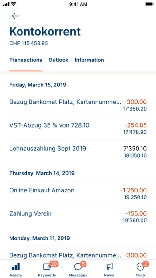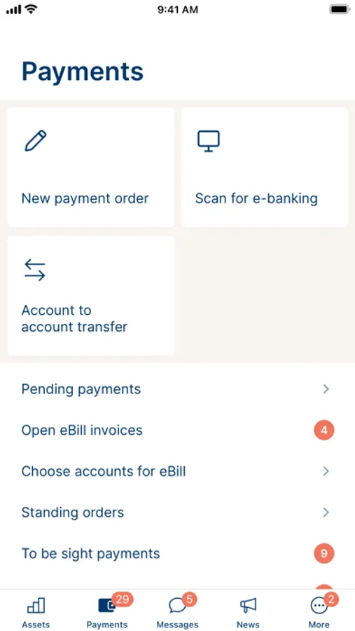 With the app you can check and pay your e-bills, scan payment slips and execute payments within Switzerland. Furthermore, you can check your pending payments.