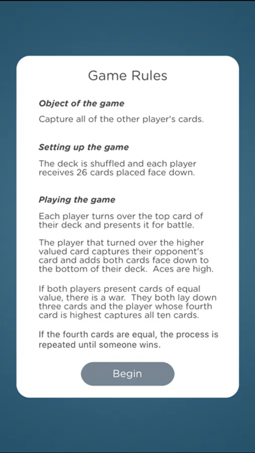 • If both players present cards of equal value, there is a war. They both lay down three cards and the player whose fourth card is highest captures all ten cards.