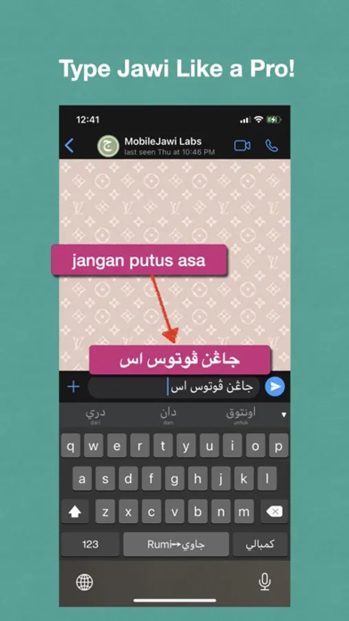 With the Rumi → Jawi keyboard, you type the text with the standard qwerty keyboard used for English and Malay. MobileJawi includes an engine that will transliterate the Malay words from Rumi to Jawi as you are typing.