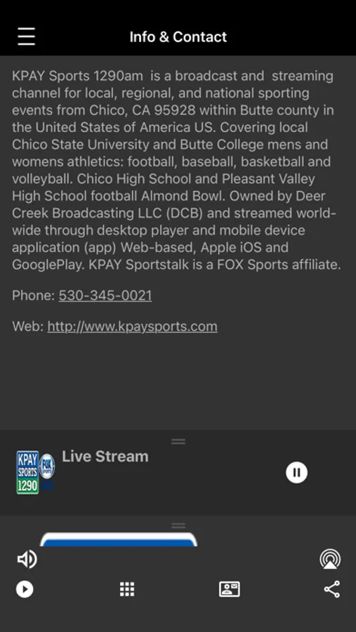 KPAY SPORTS KPAY-AM is a radio station located in Chico, CA within Butte County, USA. The station broadcasts on 1290AM, and is popularly known as KPAY SPORTS and streamed world-wide on http://kpaysports.com for local sporting events from Chico, CA within Butte County in the United States of America. Covering local Chico State University and Butte College mens and womens athletics: football, baseball, and basketball Chico High School and Pleasant Valley High School Almond Bowl. Including NFL NBA MBL, and Hockey, Owned by Deer Creek Broadcasting LLC (DCB) 2654 Cramer Lane, Chico, CA 95928 530-345-0021