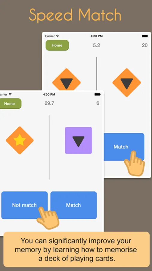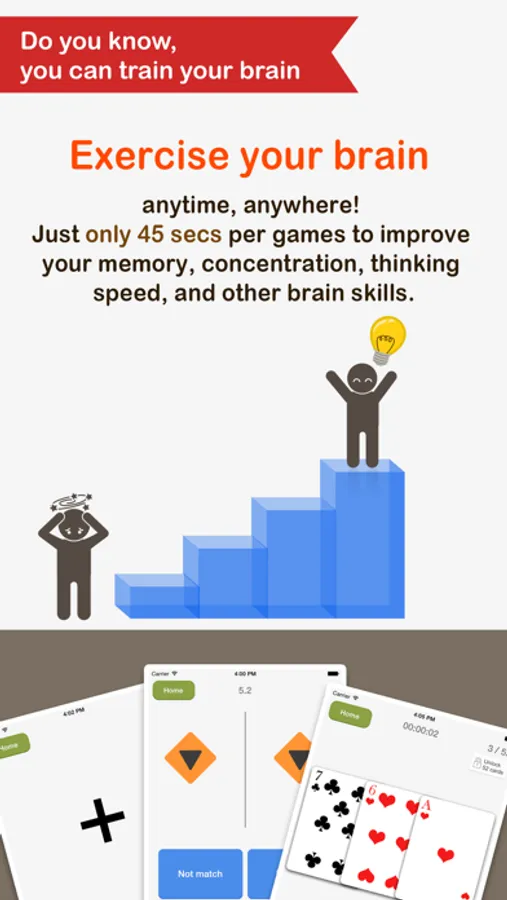 Exercise your brain anytime, anywhere! Just only 45 secs per games to improve your memory, concentration, thinking speed, and other brain skills.