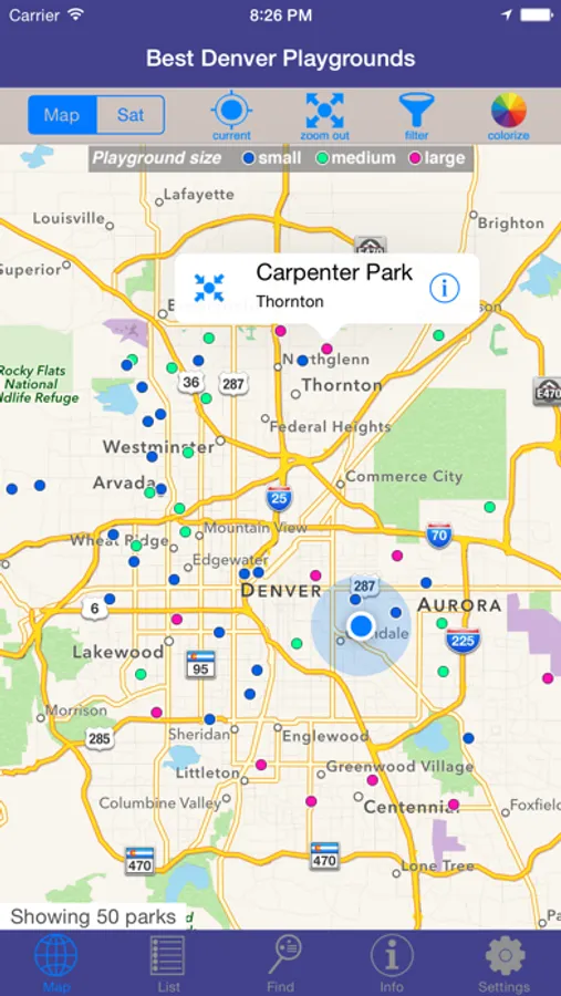 This app reviews 90 top-rated playgrounds in the Denver metro area, with 10 photographs for every playground, equipment descriptions, and a detailed rating system. The very best play areas were carefully selected from the nearly 800 public playgrounds in metro Denver. The app also offers the ability to mark favorites, search and sort by various criteria, and show driving/walking directions to each playground.