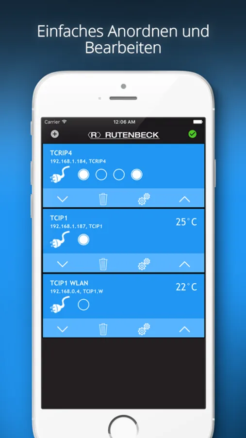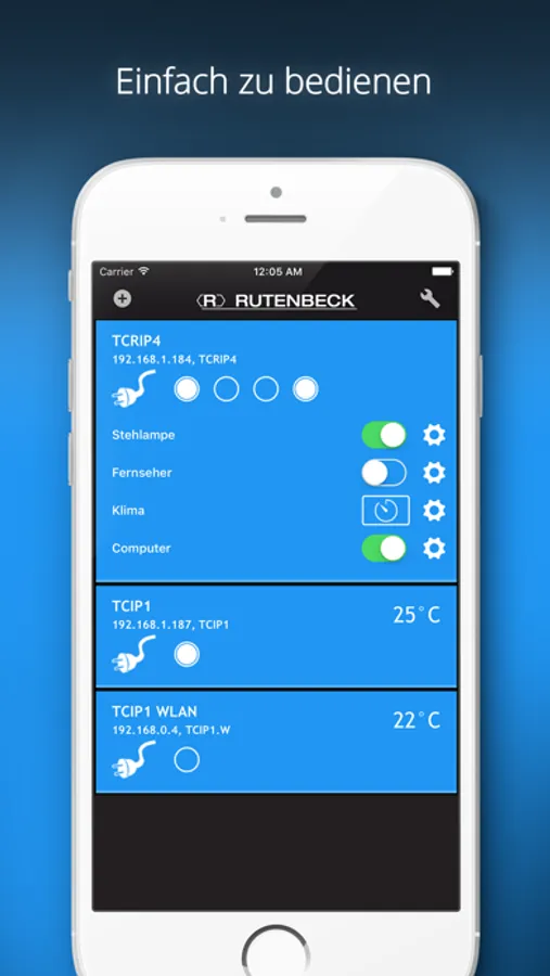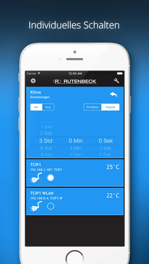 Schalten Sie Ihre Rutenbeck-IP-Fernschaltgeräte bequem per App und behalten Sie den aktuellen Schaltzustand auch bei mehreren Geräten mit Hilfe der Übersicht einfach im Blick. Wenn an Ihrem IP-Schaltaktor ein Temperaturfühler angeschlossen ist wird zusätzlich zum Schaltzustand auch die aktuelle Temperatur angezeigt - so ergeben sich vielfältige Anwendungsbereiche für die über das Netzwerk schaltbaren Geräte. Wählen Sie zwischen einfachem An- und Ausschalten oder schalten Sie Ihre Geräte über unsere App für bestimmte Zeiträume ein oder aus.