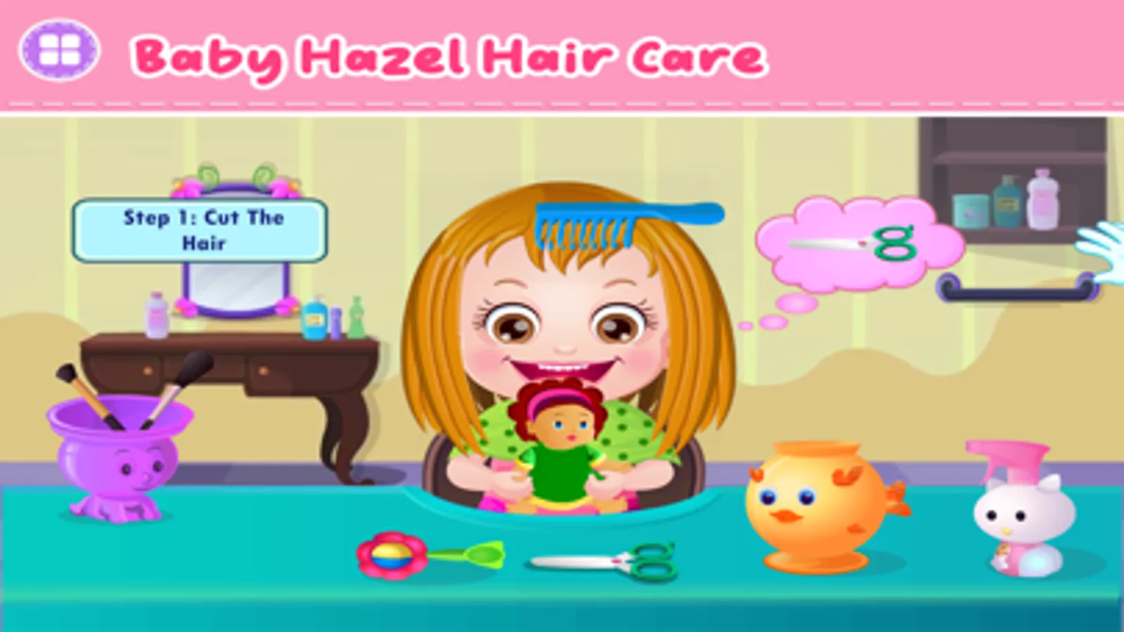 Today is Cute Baby Hazel's Hair Day. Her hairs have grown long making it difficult to maintain for our little princess. So she needs an urgent hair cut followed by hair treatment for dandruff. So here you get a chance to take care of Baby Hazel hairs. First of all give her a cute hair cut. Then give a dandruff treatment and wash her hairs with shampoo and conditioner, so that our little princess gets a soft and silky hairs. Finally dress up our little princess and tie 2 little ponies with her favorite hairband.