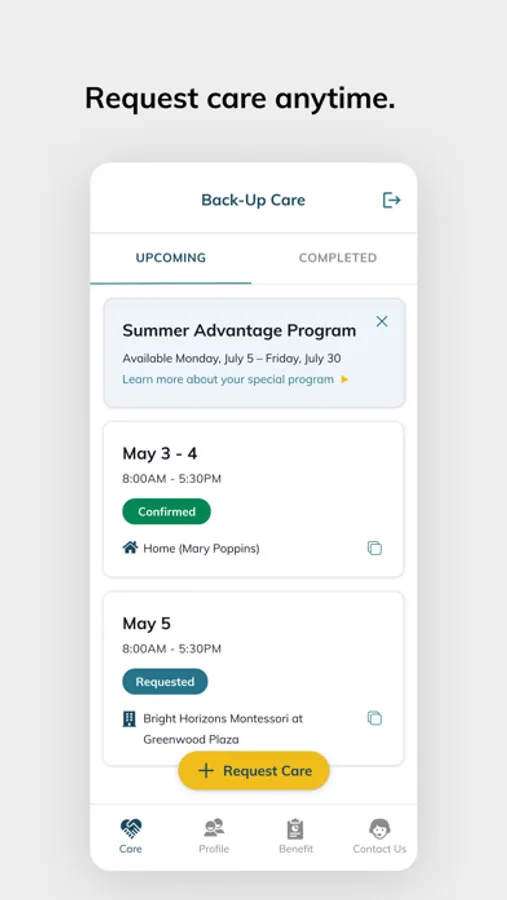 *Please note: Your employer must participate in Bright Horizons Back-Up Care in order to use this app. Not all employers who participate allow the use of this app. Please contact your human resources department for information on benefit availability.