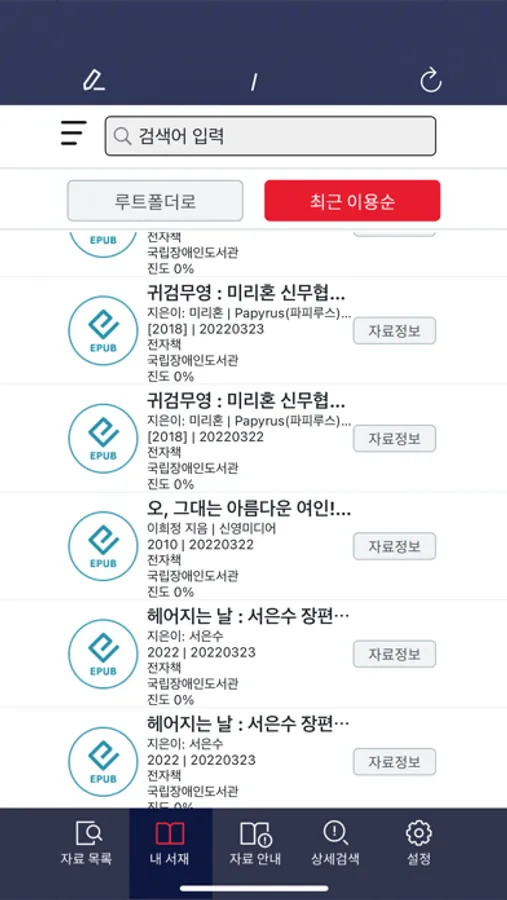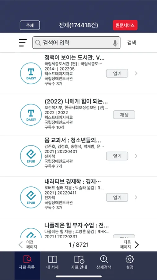O 국립장애인도서관과 협력한 도서관에서 제작한 대체 자료 목록을 검색하고, 텍스트 데이지, 오디오 데이지 및 mp3 녹음자료 원문 서비스, 전자책을 이용할 수 있습니다. 향후 참여기관 확대를 통해 더욱 다양한 원문 서비스를 제공할 예정입니다.