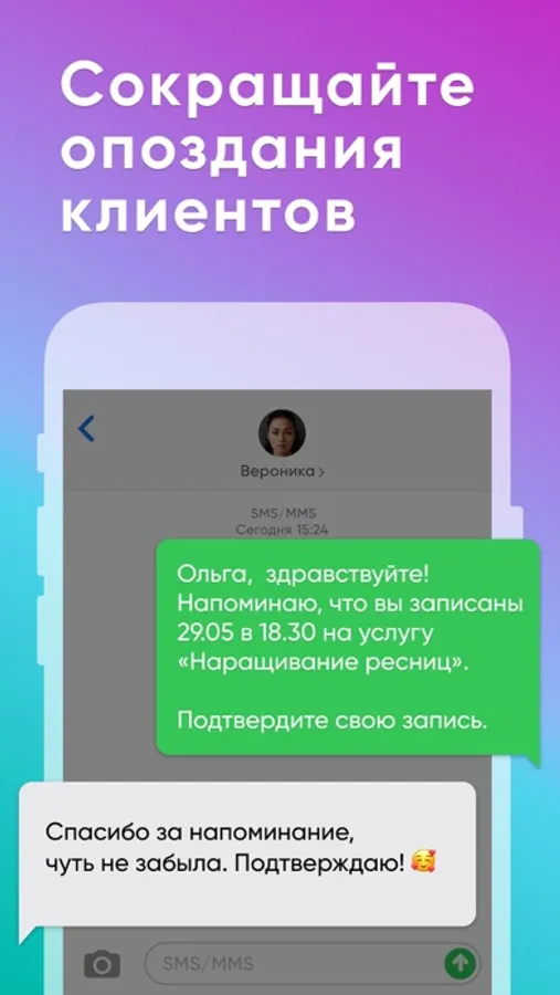 СМС НАПОМИНАНИЯ О СЕАНСАХ - Сокращайте неявку и опоздания клиентов с помощью автоматических смс напоминаний за 2 и 24 часа до начала сеанса.